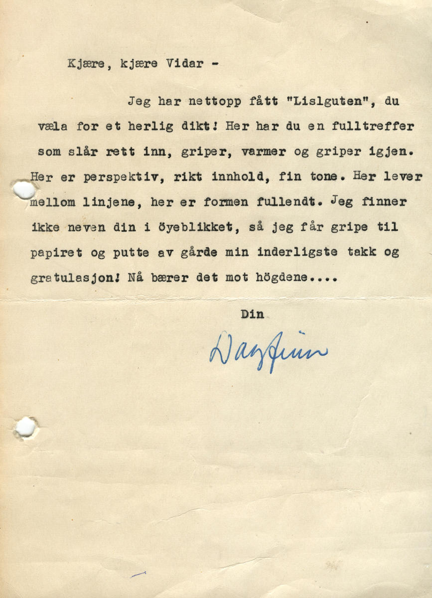 Dette brevet fra 1948, er et godt eksempel på hvordan Grønoset kunne oppmuntre Sandbeck. Siden har det blitt mye brevutveksling mellom de to, og ikke minst også postkort fra Grønoset til Sandbeck fra reiser til varmere land.